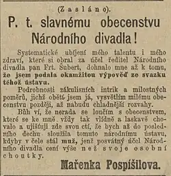 V zimě roku 1884, po ostrých sporech s režisérem o jeho rozhodnutí o obsazení, se mu odmítla nadále podřizovat a zveřejnila svůj kritický názor na poměry v divadle: ”Systematické ubíjení mého talentu i mého zdraví, které si obral za účel ředitel Národního divadla p. Fr. Šubert, dohnalo mne až k tomu, že jsem podala okamžitou výpověď ze svazku téhož ústavu. Podrobnosti zákulisních intrik a milostných poměrů, jejichž obětí jsem já, vysvětlím milému obecenstvu, až nabudu chladnější rozvahy. Bůhví že nerada se loučím s obecenstvem, které se ke mně vždy tak vlídně a laskavě chovalo, a ujišťuji zde svou ctí, že bych až do posledního dechu sloužila tomuto národnímu ústavu, kdyby v čele stál muž, jenž postvátný účel Národního divadla cení výše než svoje choutky.”[3]:s.67 Pospíšilová byla první a jediná, která o sexuálních stycích Šuberta s herečkami promluvila veřejně. Tento text vyšel v Národních listech a byl rozdáván před Národním divadlem v den představení Marie Bittnerové. Oba, Pospíšilová i Pulda, byli propuštěni. Pokoušeli se o smíření se Šubertem, ale marně. Šubert jejich omluvu nepřijal.[3]:s.67 Řada českých politiků se snažila zmírnit režisérovu tvrdost a prosila za návrat Pospíšilové, ale také marně. Šubert jí už tuto urážku na cti nikdy neodpustil.[6] Ke stížnosti Pospíšilové se nikdo veřejně nepřidal a Šubert udržoval milostné poměry s herečkami a tanečnicemi až do svého odchodu z Národního divadla. Jeden z mála, který se rozhodl stížnost Pospíšilové nesmést pod stůl, byl divadelní žurnalista Jan Ladecký, velký Šubertův kritik, který se k aféře vracel ve svém časopise Česká Thalia.