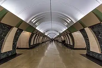 Nástupiště je s vestibuly propojeno prostřednictvím eskalátorů. Stěny na nástupišti jsou obloženy hliníkovými panely. K obložení sloupů byl využit světlý a tmavý mramor. Tmavohnědá žula obdélníkového tvaru a béžové dlaždice tvoří na podlaze geometrický vzor, který zdůrazňuje rytmus stožárů a vchodů na nástupiště. Stěny na nástupišti i východy na eskalátory jsou zkrášleny mozaikami ruského národního umělce Sergeje Vitaljeviče Gorjajeva na téma vlády hrabat Šeremetěvů.