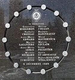 - ↑ FITZPATRICK, Meagan. National day of remembrance pays tribute to victims of Montreal massacre. CanWest News Service. December 6, 2006. Dostupné v archivu pořízeném dne 2007-12-09. Archivováno 9. 12. 2007 na Wayback Machine.