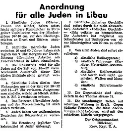 27. července 1941: „Židovský problém v Libau byl do značné míry vyřešen popravami 1100 Židů – mužů SS komandem z Rigy 24. – 25. července.“ Hans Kawelmacher, námořní velitel v Libau.[19]