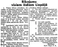 Jako námořní základna se Liepāja dostala pod vedení německého námořnictva Kriegsmarine. Nadporučík (Korvettenkapitan) Stein byl jmenován velitelem města.[5] 1. července 1941 Stein nařídil, že za každou sabotáž bude zastřeleno deset rukojmích, a dále umístil civilisty do zaměřené oblasti, když tvrdil, že se vojáci Rudé armády schovávají mezi nimi v civilním oděvu.[5] Toto bylo první oznámení o ohrožení rukojmích střelbou v Lotyšsku.[5] 5. července 1941 vydal Korvettenkapitan Brückner, který nastoupil místo Steina,[5] soubor protižidovských nařízení.[15] Byla zveřejněna v místních novinách Kurzemes Vārds.[14] Byla tato:[16]: