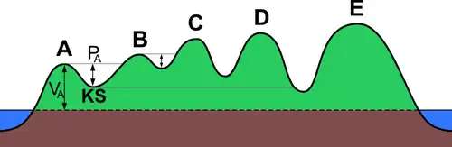 C … prominence parent A - vrchol s vyšší výškou i prominencí