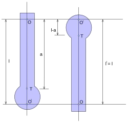 Pokud je těleso zavěšeno v bodě , který je od bodu vzdálen o redukovanou délku , dostaneme tzv. reverzní (převratné) kyvadlo. Perioda převratného kyvadla je opět dána vztahem