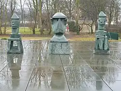 - Šachovnice, sklo, 1966. Stejně jako Marcel Duchamp byl i Ernst zaníceným šachistou, nedosahoval však jeho úrovně. Od konce 20. let se příležitostně zabýval vytvářením souprav šachových figur. V roce 1966 vytvořil skleněný šachový soubor a věnoval ho záplavami poničené Florencii.[29]