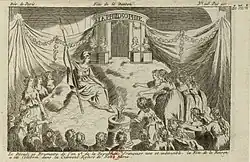 Obvinění proti Robespierrovi se brzy výrazně rozšířila – byl prý monarchistou a spojencem Angličanů, chtěl si vzít dceru Ludvíka XVI. a stát se králem či založit teokratickou diktaturu. Především byl však označen za viníka všech chyb a násilné represe uplynulého roku (případně i celé revoluce).[64] Toto období bylo nyní Tallienem označeno jako doba „Teroru“ řízeného „tyranem“ Robespierrem. To zbavovalo odpovědnosti většinu těch, kdo se na represích podíleli, a tak jim umožnilo další politickou kariéru (Barras, Tallien, Fouché). Někteří účastníci thermidorského převratu byli přesto následně označeni za „robespierristy“ a popraveni (Carrier, Fouquier-Tinville) či deportováni (Collot d'Herbois, Billaude-Varenne). Thermidorský převrat vedl k utlumení některých represivních opatření a široké amnestii, ale také k „bílému teroru“ a vzniku Direktoria, které zrušilo ústavu z roku 1793 a s ní všeobecné (mužské) volební právo, sociální opatření, pokus o zavedení základního školství a odmítlo řadu dalších revolučních ideálů.[65] Thermidor tak bývá někdy označován za konec Francouzské revoluce.