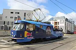 V polovině srpna roku 2024 se na pražském Rohanském nábřeží uskutečnila akce nazvaná Red Bull Showrun,[21] Její součástí se stala prezentace monopostu formule 1 označeného RB7, se kterým piloti stáje Red Bull Racing závodili ve velkých cenách v roce 2011.[22] V pracovním týdnu bezprostředně předcházejícím prezentaci závodního vozu jezdila po Praze tramvaj evidenční číslo 5572 v polepu s převažující modrou barvou, jež na své plošině místo obvyklé nádrže s vodou vozila monopost RB18, s nímž stáj závodila v roce 2022.[23]