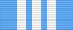 Medaile je připojena pomocí jednoduchého kroužku ke kovové destičce ve tvaru pětiúhelníku potažené hedvábnou stuhou z moaré modré barvy. Stuha je široká 24 mm. Uprostřed stuhy jsou tři bílé proužky široké 3 mm. Vzdálenost proužků od vnějšího okraje pásky je 5,5 mm a vzdálenost mezi jednotlivými proužky je 2 mm.[7][8]
