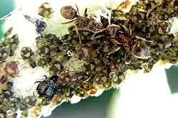 Přebytek cukrů z rostlinné šťávy je vylučován jako medovice.