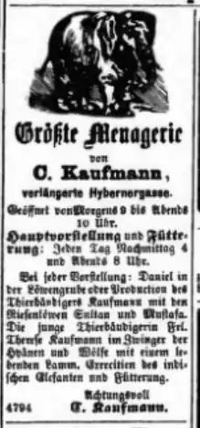 - ↑ Grösste Menagerie von C. Kaufmann. S. 16. Bohemia [online]. 1878-06-08 [cit. 2021-12-20]. S. 16. Dostupné online.