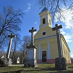 S přibývajícím počtem lidí však narůstal počet katolíků. V obci byl proto na počest Ignáce z Loyoly postaven římskokatolický kostel, jeho stavba byla dokončena roku 1832. Tuto část historie obce symbolizuje ve znaku kříž. Spodní část znaku odkazuje na období 18. století, kdy zde bylo rozšířeno pěstování obilí a vinařství.