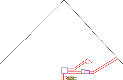 Vstup do pyramidy se nachází ve výšce asi čtyř metrů na severní straně. Šachta probíhající šikmo dolů a dlouhá 32 metrů vede do komory o rozměrech 3,63×3,16 metru s úzkými falešnými dveřmi. Na ni se napojuje vodorovná chodba chráněná třemi kamennými zátarasy. Odtud vede tunel vodorovně do středu stavby, předsíně, která byla vytesána do vzrostlé skály pod úrovní terénu. Nad tímto přístupem do předsíně se shora otevírá další přístupová šachta, která však končí slepě v podlahové desce a byla opuštěna již při výstavbě. Krátká chodba vede vchodem v podlaze předsíně do vlastní pohřební komory níže. Z chodby o několik kroků níže odbočuje postranní komora, která je vybavena šesti výklenky (každý měří asi 2,50 metru × 0,60 metru a je 1,4 metru vysoký), jejichž význam je však nejasný. Samotná pohřební komora měří 6,59 metru × 2,62 metru a je vysoká 3,43 metru. Byla celá obložena červenou žulou. Žulové trámy stropu byly opracovány tak, aby strop vypadal jako valená klenba. Komora leží asi 15,5 metru pod úrovní základny pyramidy.
