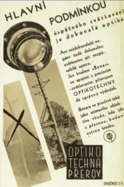 Optikotechna, Přerov 1933: Tuto společnost založil dr. Alois Mazurek, vyučující místní průmyslové školy. Intenzivně se zajímal o optiku, věnoval se samostudiu a usiloval o zavedení výuky optického oboru na průmyslové škole. Jeho úsilí došlo naplnění a v roce 1933 se jeho přání a sny realizovaly v nově vzniklé firmě se sedmi zaměstnanci, do které vložil počáteční kapitál přerovský stavitel Ing. Alois Beneš. Společnost se věnovala jak výrobě základních součástek (čoček aj.), záhy však dr. Mazurek vyvinul první československý zvětšovací objektiv Benar, a tím určil další zaměření firmy: zvětšovací přístroje (zprvu v licenci pana Kalusche Ideal a Unicum, později vlastní konstrukce Multifax, Herkules a Magnifax), hvězdářské a armádní dalekohledy, trichynoskopy, laboratorní mikroskopy aj. Roku 1935 ji zakoupila Zbrojovka Brno, která vzápětí převzala i opuštěnou bývalou textilku v Hybešově ulici a začala stavět nový závod naproti městské nemocnici. Došlo k prudkému rozvoji a modernizaci konstrukce, vývoje a výroby základních komponentů i celých přístrojů – na trh byly uvedeny nové prohlížečky filmu, triedry, puškohledy, v roce 1938 i první zvětšovák Axomat se šikmým posuvem komory a automatickým ostřením, o rok později doplněný chudším typem Opemus. Roku 1939 vznikly i první fotoaparáty Flexaret.[3]