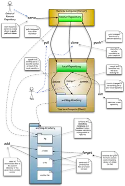 Na obrázku jsou znázorněny nejvýznamnější operace v Mercurialu a jejich vztah k celkovému konceptu.