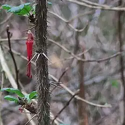 Listy rostliny jsou v období dostatku vláhy jasně zelené a s letním vysycháním půdy se jejich zbarvení mění na tmavě zelené a později dokonce opadávají. Krásná rostlina se tak na druhou polovinu roku změní v hromadu hustě propletených suchých klacků a trnů. Na stanovištích s celoročním dostatkem mírné vláhy, například v zahradách s řídkou zálivkou, listy neopadají. S nástupem vlhčího období, obvykle od ledna do května, se objevují tmavě červené fuchsiovité květy, které bývají opylovány kolibříky, motýly či jiným hmyzem, kterým rostlina poskytuje pyl i nektar. Koncem léta se z květů vyvinou červené bobule, které postupně opadají.[1][3][4][5]