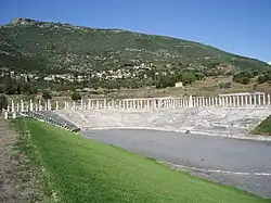Asi 200 m níže po svahu byl v posledních letech vykopávkami nalezen monumentální stadion - nejpůsobivější a nejzachovalejší zřícenina ve městě. Na stadion se vstupuje v jeho severozápadním rohu přes nově upravený propylon, postavený v dórském řádu. Na západní straně bylo bezprostředně před stadionem odkryto několik čestných hrobů.