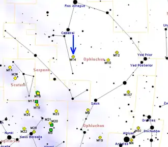 Vyhledání hvězdokupy na obloze je poněkud obtížnější, protože se blízko ní nenachází žádná jasná hvězda. Leží přibližně 10° východně od hvězdokupy Messier 10[10] a 8° jižně od hvězdy Cebalrai (β Ophiuchi). Kvůli její značné vzdálenosti od Země je těžko rozložitelná na jednotlivé hvězdy a v běžných dalekohledech tak má mléčný vzhled podobný eliptické galaxii.[1] O rozeznání jednotlivých hvězd je možné se pokusit až s dalekohledem o průměru 300 mm nebo větším. Za vhodných pozorovacích podmínek je však viditelná i triedrem 10x50.[11]