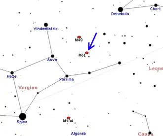 M61 leží v oblasti oblohy bez výrazných hvězd přibližně 1,2° severně od hvězdy 5. magnitudy s označením 16 Panny.[9] Může být viditelná i triedrem 10x50 nebo 11x80, ve kterém se ukáže jako velmi slabá prchavá skvrnka. Základní podrobnosti v ní lze pozorovat až přístroji o průměru 140 mm a větším, ve kterých vypadá jako skvrna, jejíž halo se rozprostírá v oblasti o průměru 5′ a která má přímo uprostřed malé jasné jádro. Při podrobnějším zkoumání je možné si povšimnout, že nemá přesně kruhový tvar, ale že vypadá mírně protažená od severovýchodu na jihozápad a v jejím halu je možné pozorovat několik zjasnění, díky kterým vypadá nesouměrně.[10]