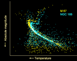 Kromě modrých opozdilců hvězdokupa neobsahuje jiné hvězdy hlavní posloupnosti žhavější než třídy F, protože všechny jasnější hvězdy již stihly opustit hlavní posloupnost. Na H–R diagramu je vlevo nahoře výrazná odbočka z hlavní posloupnosti, která odpovídá hvězdám se skončenou fúzí vodíku. Tyto hvězdy se stávají červenými obry. V průběhu milionů let se tato odbočka posunuje dolů podél hlavní posloupnosti.[17]