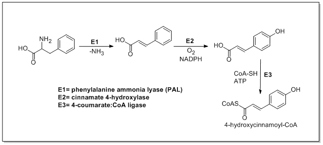 Cinamát-4-hydroxyláza mění trans-cinamát na 4-hydroxycinamát (kyselinu p-kumarovou). 4-kumarát-CoA ligáza zprostředkovává převod 4-hydroxycinamátu na 4-kumaroylkoenzym A.[1]