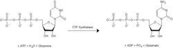 Pyrimidinové nukleotidy zahrnují cytidin, uridin a thymidin. Syntéza pyrimidinového nukleotidu začíná tvorbou uridinu. Tato reakce vyžaduje aspartát, glutamin, hydrogenuhličitan a 2 ATP molekuly (k zajištění energie), stejně jako PRPP, který poskytuje monofosfát ribózy. Na rozdíl od syntézy purinu se skupina cukru a fosfátu z PRPP přidává k dusíkaté báziaž na konci procesu. Po syntéze uridin-monofosfátu může reagovat s 2 ATP za vzniku uridin-trifosfátu (UTP). UTP může být konvertován na CTP (cytidin-trifosfát) v reakci katalyzované CTP syntetázou. Syntéza thymidinu vyžaduje nejprve redukci uridinu na deoxyuridin ( viz následující část ), než může být báze methylována za vzniku thymidinu.[1][4]