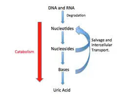 Rozpad DNA a RNA probíhá v buňce kontinuálně. Purinové a pyrimidinové nukleosidy mohou být buď degradovány na odpadní produkty a vylučovány nebo mohou být zachráněny jako nukleotidové složky.[4]