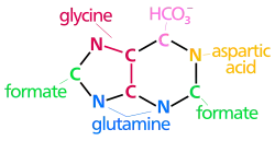 Adenin a guanin jsou dva nukleotidy klasifikované jako puriny. Při syntéze purinu se PRPP mění na inosinmonofosfát (IMP). Produkce IMP z PRPP vyžaduje, kromě jiného glutamin, glycin, aspartát a 6 ATP.[1] IMP se pak převede na AMP (adenosinmonofosfát) za použití GTP a aspartátu, který se převede na fumarát. Zatímco IMP může být přímo přeměněn na AMP, syntéza GMP (guanosinmonofosfát) vyžaduje meziproces, ve kterém se užije NAD+ pro vytvoření meziproduktu xanthosin monofosfát (XMP). XMP se pak přemění na GMP hydrolázou jednoho ATP a konverzí glutaminu na glutamát. [1] AMP a GMP pak mohou být přeměněny na ATP a GTP kinázami, které přidávají další fosfáty.