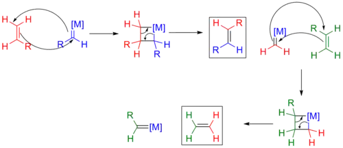 Metallocyklobutany jsou meziprodukty metateze alkenů a oligomerizace a dimerizace ethenu. Při metatezi alkenů dochází k ataku alkenu na elektrofilním karbenu kovu, sloužícím jako katalyzátor.[5][6][7]