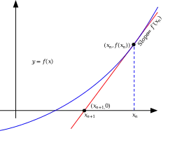 Dalším nezbytným předpokladem je znalost počáteční hodnoty , v jejíž blízkosti hledáme řešení. Pokud se funkce chová rozumně (je spojitá, hladká a monotónní v intervalu, ve kterém hledáme řešení), lze očekávat řešení v místě, kde tečna sestrojená z bodu protíná osu . (Směrnice této tečny je .) Tento průsečík označíme a vypočteme jej podle následujícího vztahu.