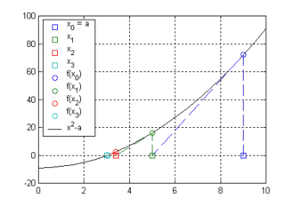 a = 9 x0 = 9 x1 = 5 x2 = 3.4 x3 = 3.02352941176471 x4 = 3.00009155413138 x5 = 3.00000000139698 x6 = 3.00000000000000 x7 = 3.00000000000000