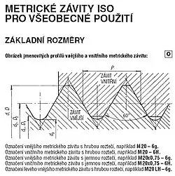 Úhel profilu činí 60°. Veškeré rozměry závitu se udávají v milimetrech (mm).