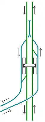 - Přestup mimoúrovňový: Dvě nástupiště, která jsou umístěna v různých úrovních, propojují přestupní chodby. V nižším nástupišti je chodba vyvedena z jeho středu přes jednu z kolejí kolmo k její ose. Do vyššího nástupiště pak zaúsťuje také v jeho středu; vychází však zpod její úrovně z jakéhosi přestupního vestibulu. V případě, že jednou stanicí prochází více linek, se přestupní chodby kombinují a složitě kříží.