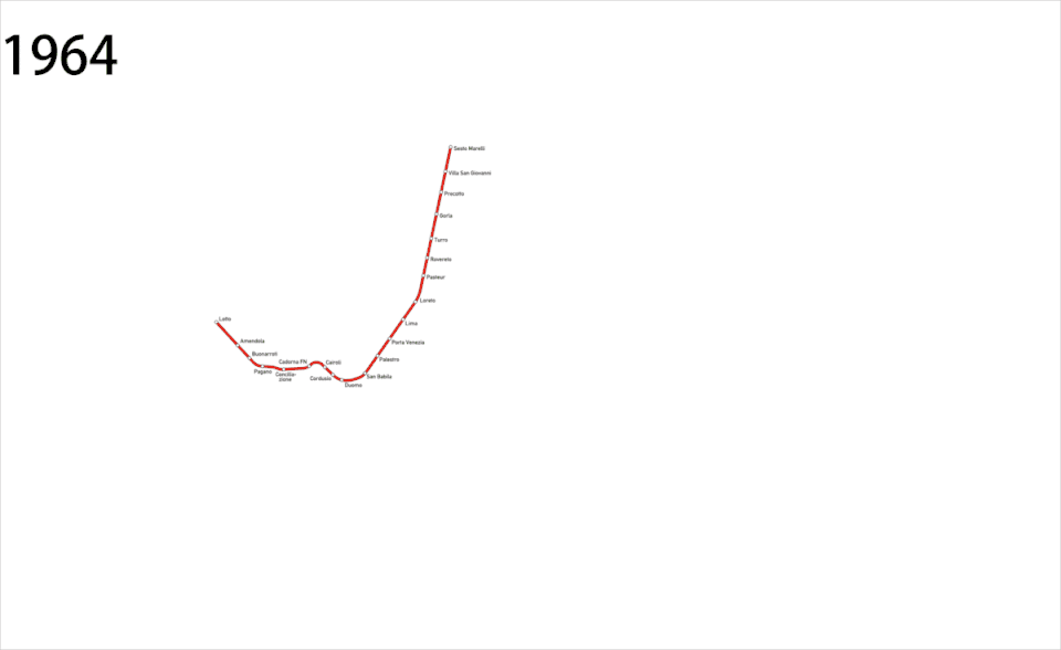 První úsek z Lotto do Sesto Marelli (21 stanic) byl slavnostně otevřen 1. listopadu 1964, po 7 letech práce. Ve stejném roce, v dubnu, byly zahájeny práce také na druhé lince. V roce 1966 byla slavnostně otevřena větev linky M1, úsek Pagano – Gambara, se dvěma mezistanicemi. Dne 27. září 1969 vstoupila linka M2 do provozu na prvním úseku z Caiazzo do Cascina Gobba (7 stanic), včetně stanice Lambrate FS, důležitého přestupního uzlu s železniční stanicí Lambrate.[5]