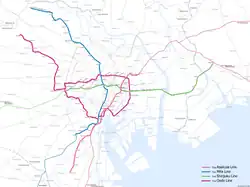 | Tmavě modrá | I | 6 | Toei Mita | 都営三田線 | Širokane-takanawa – Niši-takašimadaira | 24,2 km |