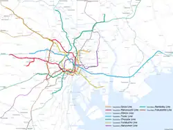 | Světle zelená | S | 10 | Toei Šindžuku | 都営新宿線 | Šindžuku – Moto-Jawata | 23,5 km |