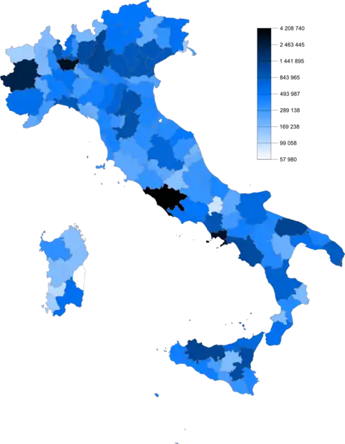 | Hl. město Řím | RM | Lazio | 4 342 212 | 5 352 | 814 | 121 | Virginia Raggi | M5S | ||