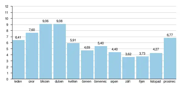 Průměrné dlouhodobé měsíční průtoky Metuje (m³/s) ve stanici Jaroměř:[26]