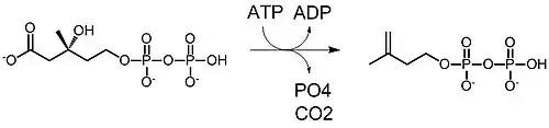 Mevalonát-5-pyrofosfát se dekarboxyluje za tvorby isopentenylpyrofosfátu (IPP). Spotřebuje se 1 ekvivalent ATP. |