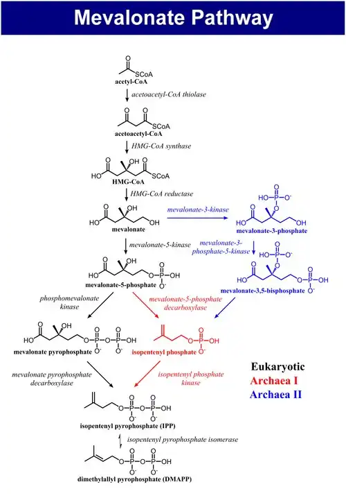 - ↑ VINOKUR, Jeffrey M.; KORMAN, Tyler P.; CAO, Zheng. Evidence of a Novel Mevalonate Pathway in Archaea. Biochemistry. 2014-07-01, roč. 53, čís. 25, s. 4161–4168. Dostupné online [cit. 2025-01-31]. ISSN 0006-2960. doi:10.1021/bi500566q. PMID 24914732. (anglicky)