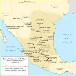 Válka začala pod vedením Miguela Hidalgy y Costilla, kněze v Dolores, 16. září 1810, když Hidalgo ve veřejném projevu přesvědčil obyvatelstvo, že je potřeba vymanit se ze španělského útlaku. Další spojence našla skupina v sousedním městě San Miguel de Grande, kde se k ní připojil také poručík Ignacio Allende, další z vůdčích postav revoluce. Dobyla další města, 21. září Celayu a pak 28. září Guanajuato, přičemž se postupně rozrostla na několik desítek tisíc bojovníků. Pak se ovšem jejich postup zastavil a španělští monarchisté 24. listopadu dobyli Guanajuato zpět. Skutečným obratem ve válce byla ale bitva u mostu přes Calderón 11. ledna 1811, kde početně mnohonásobně slabší monarchisté povstalce zahnali na útěk a způsobili jim velké ztráty.