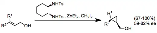 Často používanou alternativou cyklopropanací katalyzovaných rhodiem je Simmonsova-Smithova cyklopropanace, využívající karbeny odvozené od diethylzinku a dijodmethanu. Za přítomnosti chirálních diaminů jsou Simmonsovy-Smithovy cyklopropanace enantioselektivní, i když jsou selektivity nižší.[25]