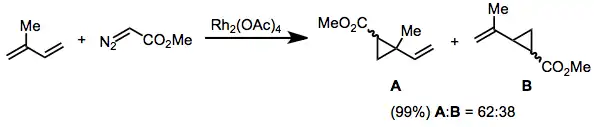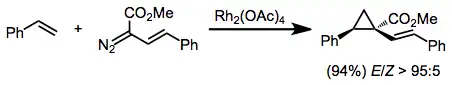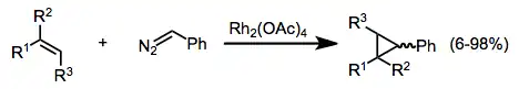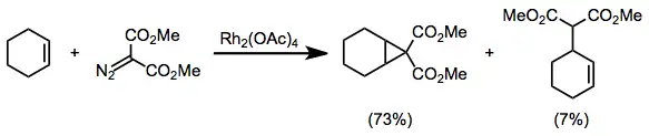 Cyklopropanace alkenů diazokarbonylovými sloučeninami jsou většinou katalyzovány sloučeninami rhodia, ale původně se používaly komplexy mědi.[11] Při katalýze rhodiem lze jako substráty použít alkeny s vysokou,[12] střední,[13] i nízkou elektronovou hustotou.[14]