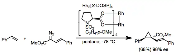 Stereoselektivní přípravy cyklopropanů z diazokarbonylových sloučenin a alkenů mohou být založeny na předem připravených rhodiových katalyzátorech, nebo na chirálních pomocnících navázaných na diazokarbonyly; vysoce účinným katalyzátorem takových reakcí je například Rh2[S-DOSP]4.[9]
