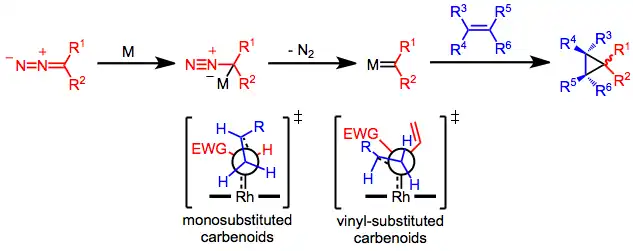 Cyklopropany lze vytvořit reakcemi karbenoidů (získaných z diazosloučenin, přechodných kovů) a alkenů. Přestože je vnitromolekulární provedení takových reakcí známo od roku 1961,[2] tak byly chemo- a stereoselektivní mezimolekulární cyklopropanace katalyzované kovy vyvinuty později. Nejčastějšími katalyzátory jsou komplexy karboxylátů, například octanu rhodnatého. Enantioselektivní cyklopropanace obvykle využívají předem vytvořené komplexy chirálními ligandy.[3]