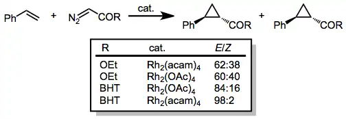 Diazoacetáty obsahující jedinou karbonyl skupinu navázanou na diazouhlík lze použít s mnoha různými alkeny. Diastereoselektivita ve prospěch (E)- cyklopropanů roste s velikostí esterové skupiny. Diastereoselektivitu zlepšuje také zvýšení elektronové hustoty na katalyzátoru (například nahrazením acetátových skupin acetamidovými).[15]