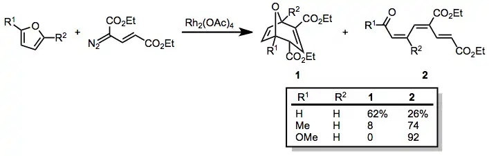 Furany reagují s vinyldiazoacetátry podobně, ale cyklopropanový meziprodukt se kromě Copeova přesmyku může také přeměnit na otevřenou nenasycenou karbonylovou sloučeninu. Rozdělení produktů je výrazně ovlivňováno substituenty na furanovém kruhu.[21]