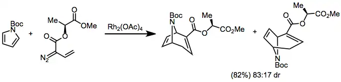 Pyrroly s vinyldiazoacetáty vytváří cykloheptadieny obsahující dusíkové můstky. Při použití methyllaktátových chirálních pomocníků lze dosáhnout dobré diastereoselektivity v tandemech cyklopropanací s Copeovými přesmyky na pyrrolech s navázanými terc-butoxykarbonylovými chránicími skupinami.[22]