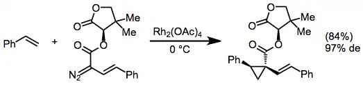 K diastereoselektivním cyklopropanacím s využitím diazoesterů lze použít chirální pomocníky odvozené od chirálních alkoholů (například pantolaktonu).[10]