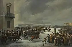 O osmé hodině večerní[14] 25. prosince se Mikuláš prohlásil imperátorem; v sedm hodin ráno následujícího dne, v přítomnosti vedoucích státníků, přislíbil Miloradovič carovi poslušnost.[15]