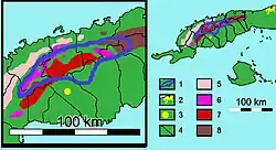 1– Oblast s rostlinami Microcycas calocoma. 2– Havana. 3– město Pinar del Río. 4– provincie Pinar del Río. 5– kopce Pizarrosas del Norte (sever) 6– hory Sierra de Los Órganos. 7– Alturas Pizarrosas del Sur (jih) 8– hory Sierra del Rosario