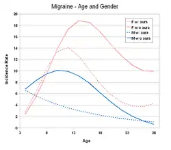 Aura je přechodný fokální neurologický jev, který se objevuje před nástupem bolesti hlavy nebo v jejím průběhu.[15] Aura přichází postupně v řádu minut a obvykle trvá méně než 60 minut.[19] Symptomy mohou být vizuální, senzorické či motorické povahy a mnoho osob zažívá více než jeden z nich.[20] Nejběžnější jsou vizuální efekty, které se objevují až v 99 % případů, přičemž více než v polovině případů jde výhradně o ně.[20] Častou poruchou vidění je scintilační skotom (oblast částečného zkreslení zorného pole s mihotajícími se světly).[15] Ten obvykle začíná poblíž středu zorného pole a šíří se do stran v podobě klikatých čar, jež jsou přirovnávány k liniím opevnění či hradebních zdí.[20] Čáry jsou obvykle černé a bílé, někteří lidé však vidí i čáry barevné.[20] U skupiny pacientů dochází ke ztrátě části zorného pole, což je jev známý jako hemianopsie, zatímco jiní vidí rozmazaně.[20]